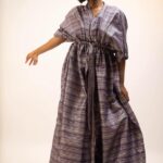 This luxurious purple striped maxi kaftan gown exudes effortless elegance in a rich, silky fabric with alternating deep purple and silver-grey stripes for a sophisticated, shimmering effect. It features a relaxed, flowy silhouette with short batwing sleeves, a classic V-neck wrap front, cinched waist via a matching tie belt for adjustable shaping, and a dramatic floor-length hem that drapes beautifully for movement.