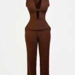 This chic chocolate brown two-piece set features a sleeveless, deep-plunge peplum corset top with a structured bow-front cutout and a flattering cinched waist, paired with high-waisted, straight-leg trousers for a sleek, modern silhouette.